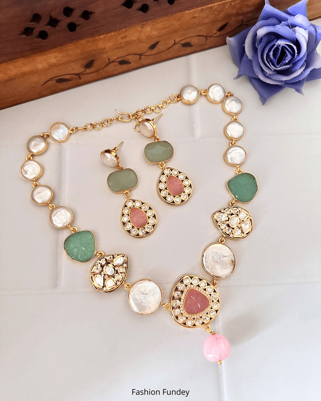 At Fashion Fundey, we use all premium material to handcraft every product exclusively for you. High quality pearls & kundan, precious carved stone, semi-precious stones, intricately handpaint meenakari are few of the things we work, along with high quality brass metal. With right care, it should last you for a long time.