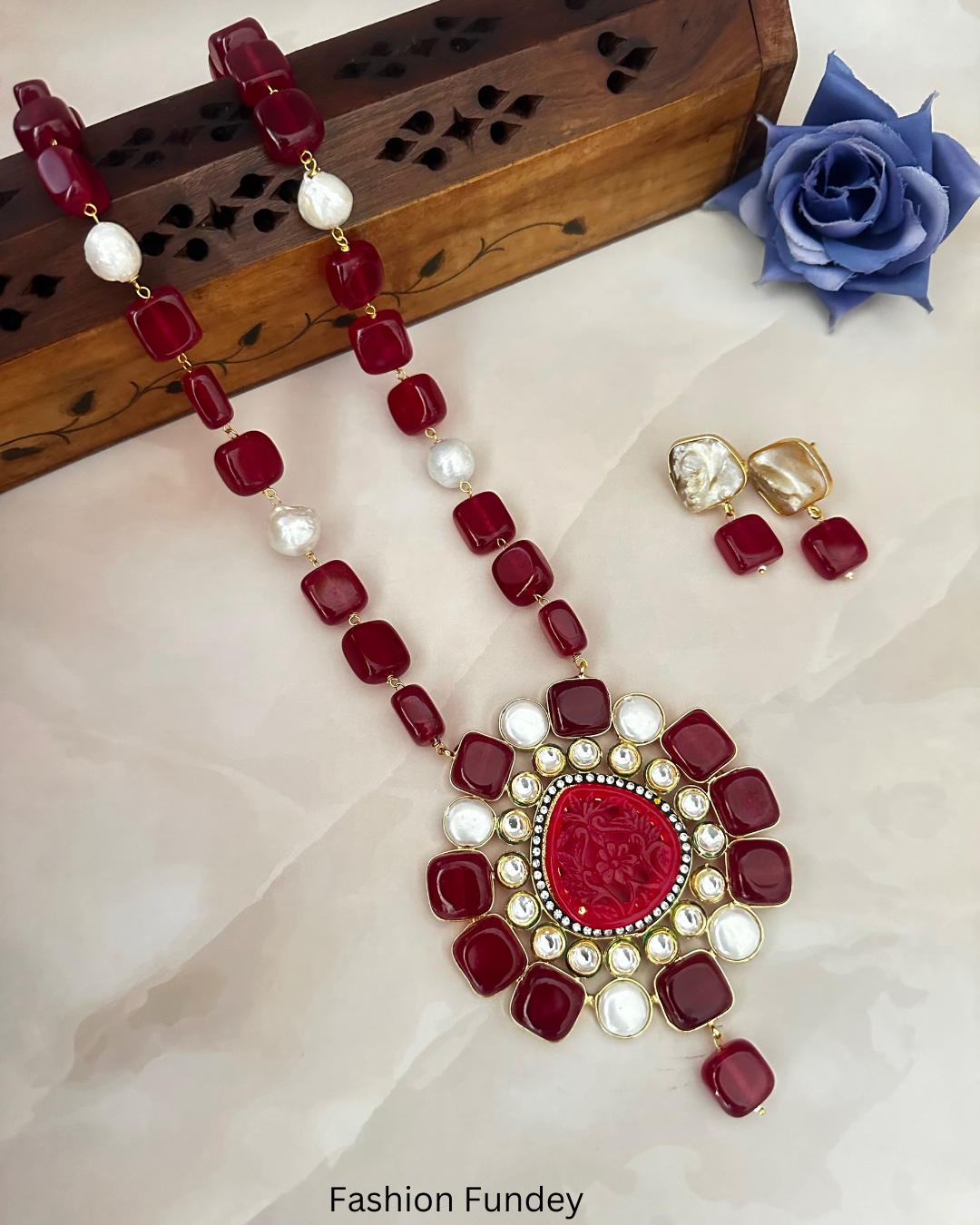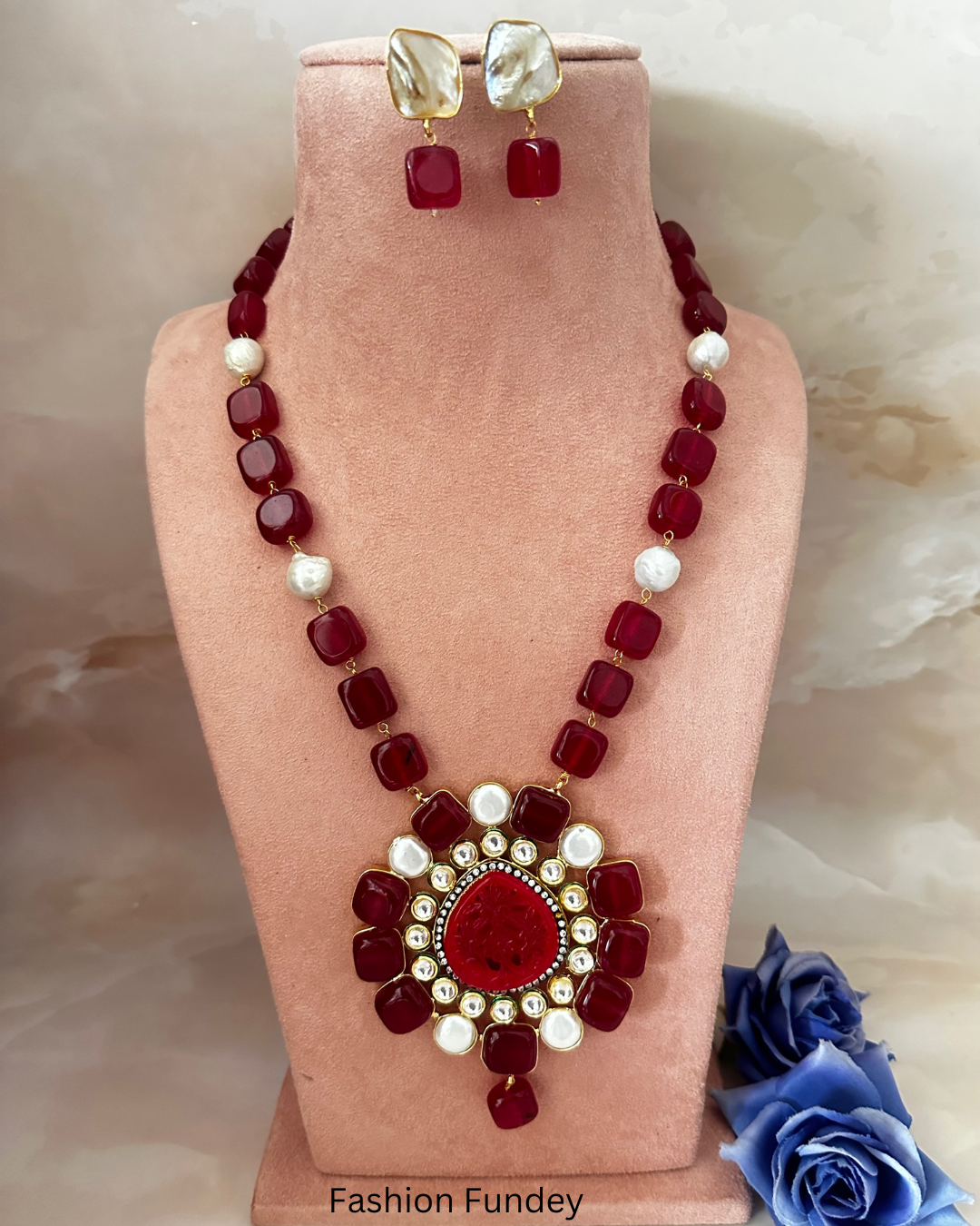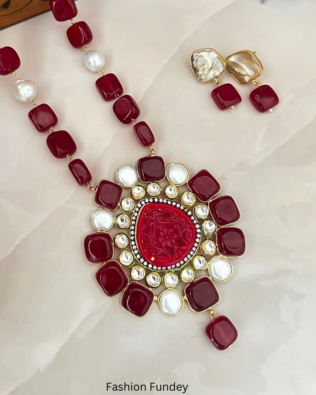 Miraya Pearl Pendant is for ladies who like to ooze class and royalty. The array of natural stone looks expensive while the gorgeous carved stone pendant is spectacularly stunning. Great for special occasions like weddings and parties.